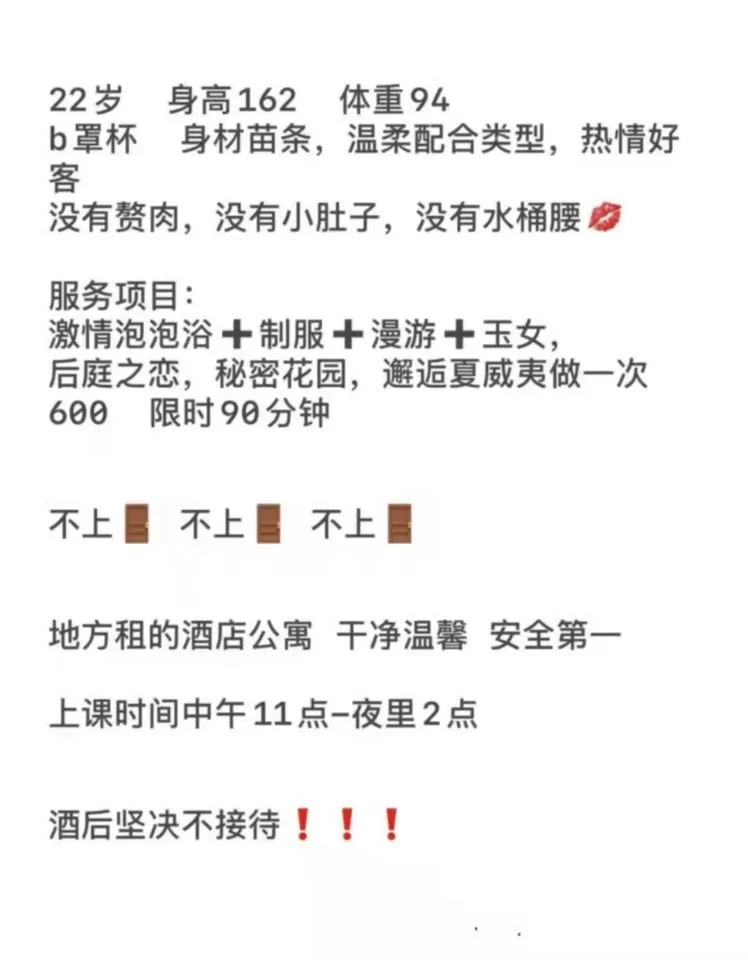 威客管理提示:要求付定金 保证金的,总之提前要钱的都是骗子 通过qq群里得到的联系方式(手机号/QQ/微信)。联系上之后等到周末中午吃完饭就去了,经过引导一步步来到住所。开门一看,哇,真的是不错,正是我喜欢的类型,不胖不瘦。有一种小巧的感觉(本人比较壮)。姐姐很热心的拉我进去,稍微交流了下我就迫不及待拉着姐姐共浴。脱了衣服,我的弟弟早已一柱擎天,草草的一洗,躺到床上,姐姐也慢慢爬了上来,温柔的抚摸着我的身体,然后小脸贴到我的弟弟上轻轻摩擦,看我发硬的弟弟,姐姐直接用嘴亲了亲,一口含了进去,舌头非常灵活,爽的我都呻吟了。特别是冰火的时候,弟弟感觉快要爆炸了。口了一会儿,我让姐姐穿上了一套黑丝装(本人最喜黑丝高跟),双手不停的揉捏姐姐富有弹性的屁股。姐姐给我带上了小雨衣,然后我挺起弟弟直接就插了进去,好紧啊,我赶紧屏住呼吸,忍住了射的感觉。停顿之后就慢慢开始抽插。姐姐也轻轻的呻吟,抱着我。换了几个姿势不停的抽插,最后用老汉推车的方式狠狠的射了进去。事后搂着姐姐平息了下心情,说了会话,约好下次还来,就出门走人。