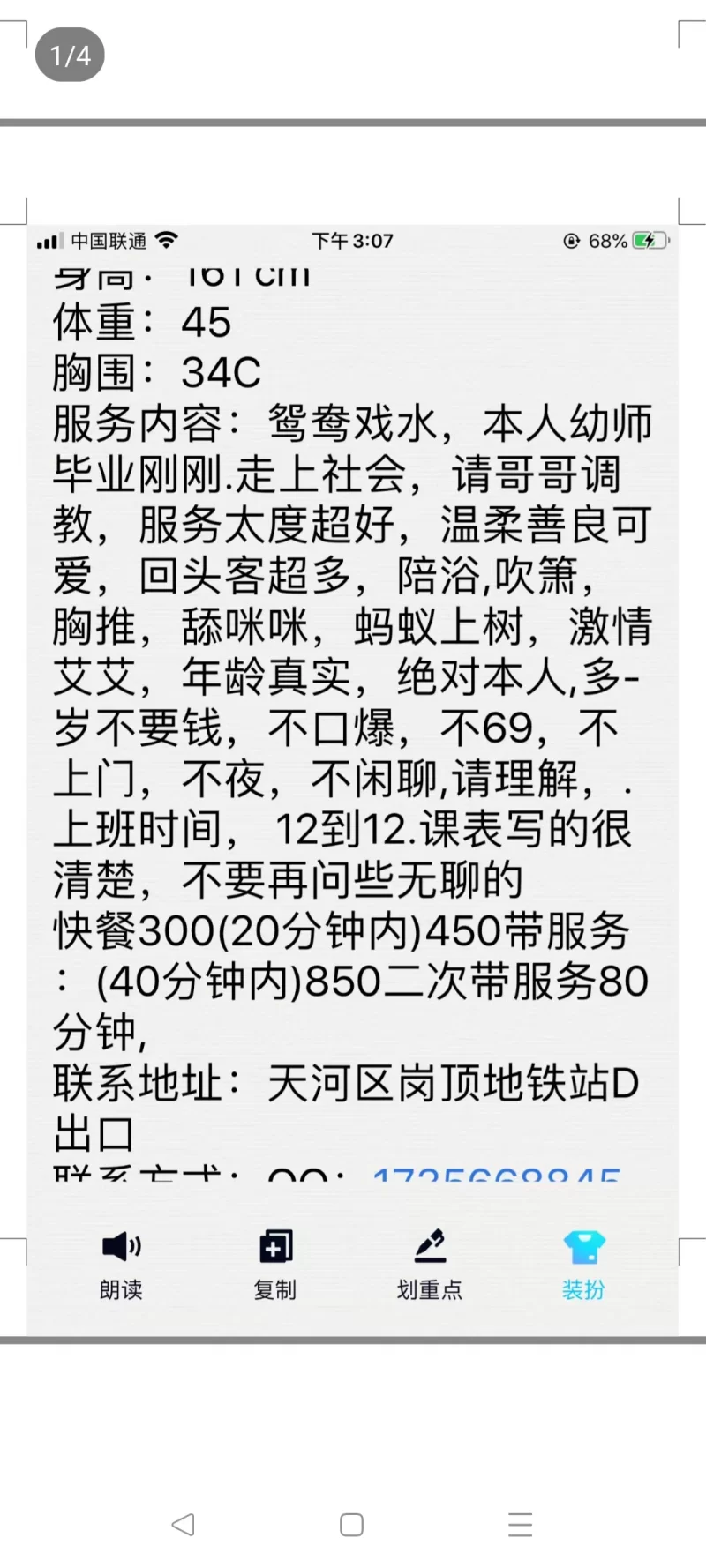 信息分类:骗子曝光 地区:广东省-广州 信息来源:老哥稳 年龄:25+ 颜值身材:一般 服务项目:没有,隔TC 价格:450+ 环境设备:差 详细地址: (管理提示:经用户举报,此信息有诈骗行为,请勿被骗!) 联系方式(QQ号): (管理提示:经用户举报,此信息有诈骗行为,请勿被骗!) 详细介绍: 就是个中介,安排了妹子开房就叫你去开好的房间。和课表的完全不一样,什么服务都没有。隔着套吹硬了就直接上。 骗子曝光