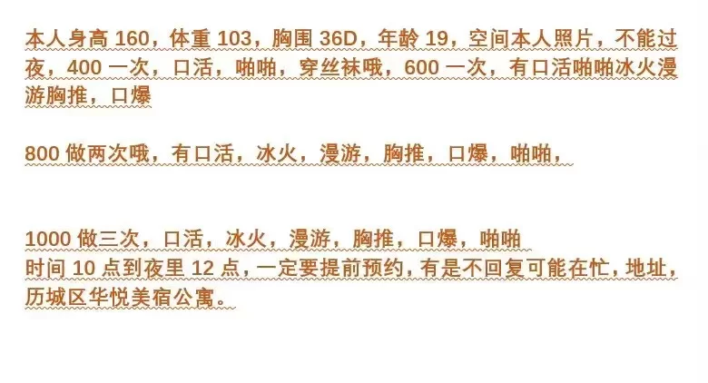 信息分类:楼凤兼职 地区:山东省-济南 信息来源:个人经历 年龄:25 颜值身材:85 服务项目:啥都有 价格:300-1000 环境设备:好 详细地址:本段信息已隐藏,请先登陆。点击登陆 , 或者 点击注册 联系方式(微信):本段信息已隐藏,请先登陆。点击登陆 , 或者 点击注册 详细介绍: 人爽活好还不贵,有丝袜,确实诱惑,00后年纪不大,全套400,包夜1000. 楼凤兼职
