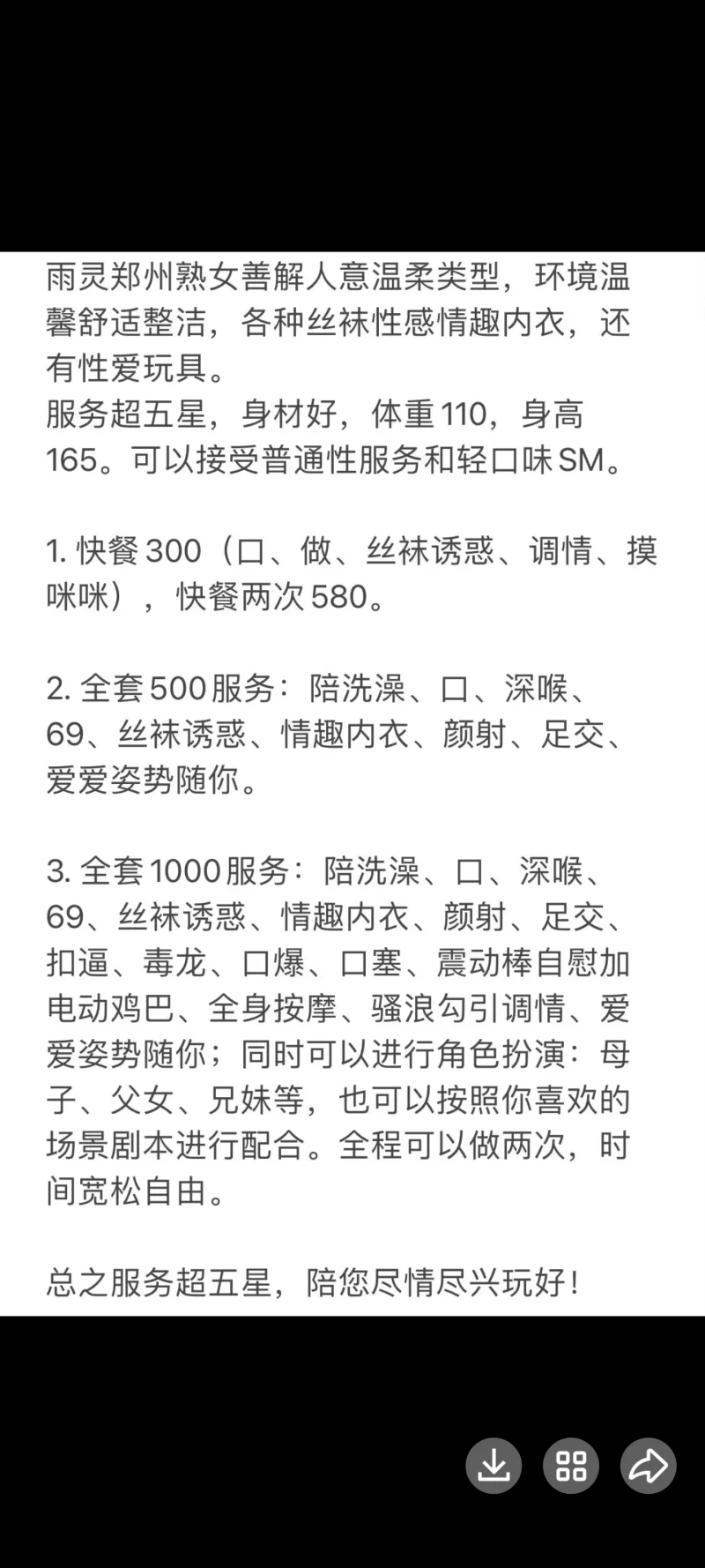 信息分类:楼凤兼职 地区:河南省-郑州 信息来源:朋友推荐 年龄:35左右 颜值身材:瘦瘦的 服务项目:快餐,全套,SM调教 价格:快餐300全套500 环境设备:自己租的公寓 详细地址:本段信息已隐藏,请先登陆。点击登陆 , 或者 点击注册 联系方式(QQ号):本段信息已隐藏,请先登陆。点击登陆 , 或者 点击注册 详细介绍: 瘦瘦的,只要价钱给到位都能玩 楼凤兼职