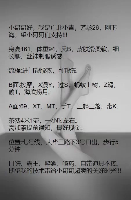 最近这边查的比较严 很多足浴按摩的店都不开门营业了 我就去浴场看看。洗完澡我就跑去休息大厅休息了。然后里面就有几个妹纸做在角落 一个妹纸给我倒了杯水 问我要不要服务。 我瞟了一眼看见一个短发妹纸看起来比较年轻 比较骚 我就问她什么价格 基本360全套服务 妹纸找的特别好看 特别骚 口活也比较好 听话配合 妹纸的牌 是22 有兴趣的话可以去试一下